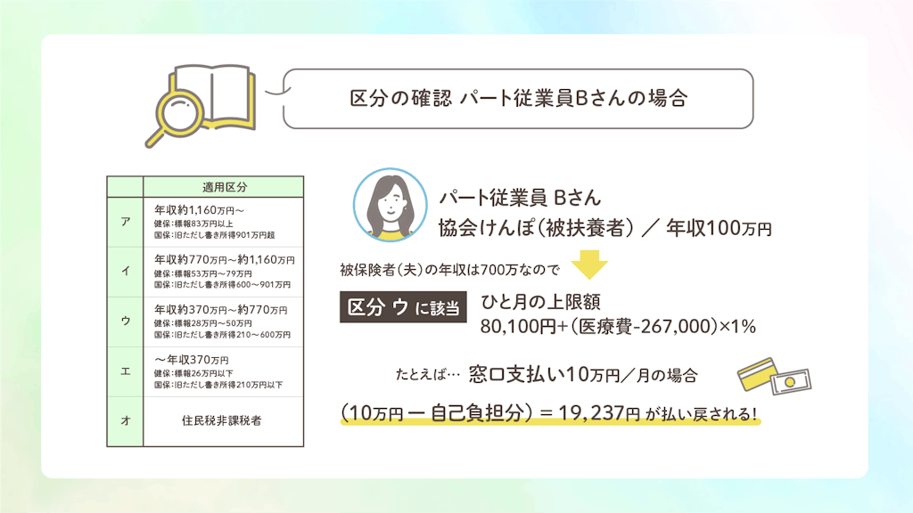高額療養費制度は公的医療保険の制度なので、保険の被保険者に紐づいて限度額が決められます。女性の場合、パートタイムなどで働いている方は、区分を間違えやすいので気をつけましょう。