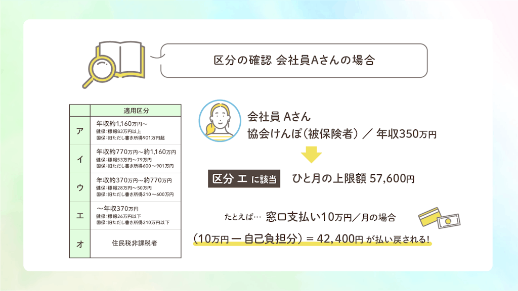 Aさんは会社員で、ご自身が被保険者で社会保険に加入しています。この場合、ご自身の年収350万円を基準に区分をみるので、適用区分は「エ」に該当します。